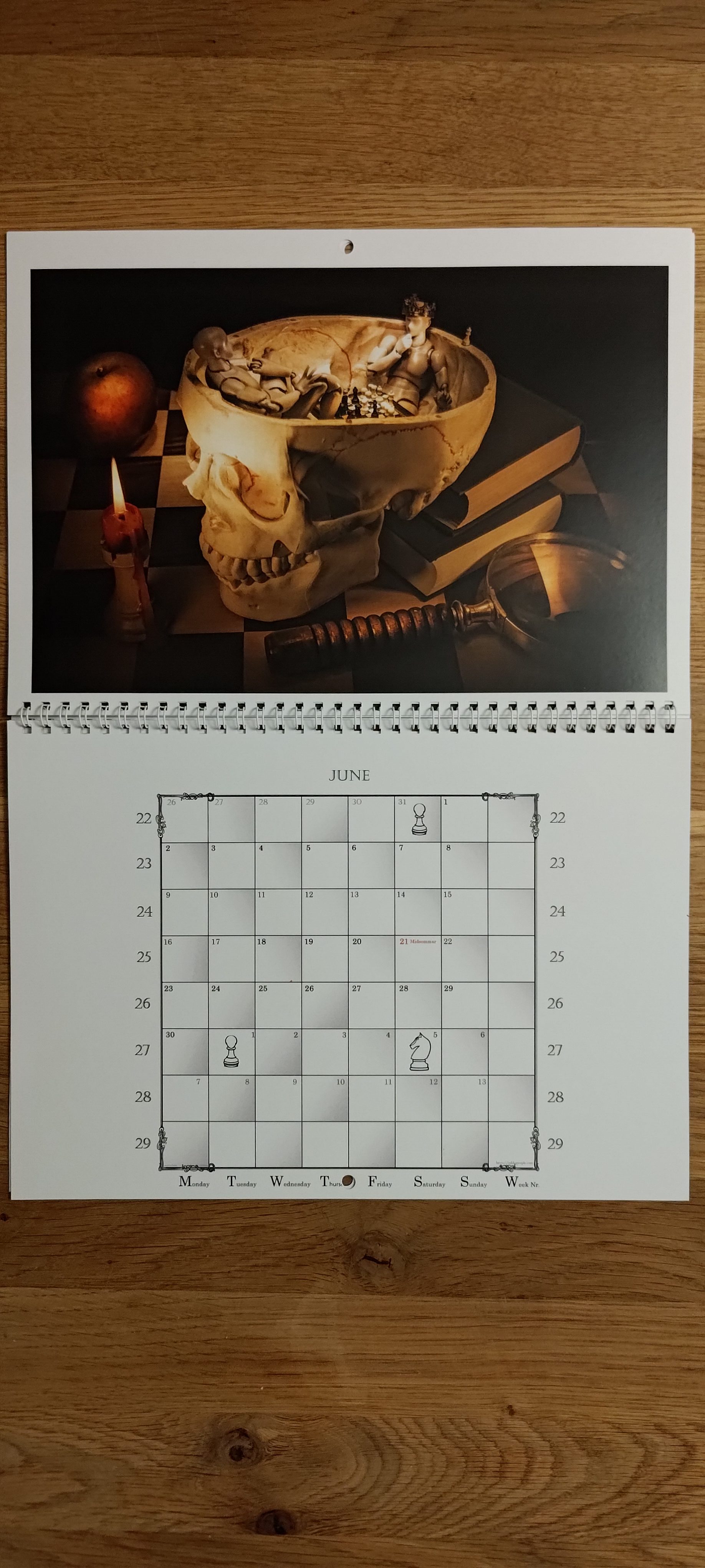 Since 7-day-weeks are put on the 8×8 square chessboard you have an extended view of each month to come, so it’s more like one-and-a-half month per calendar page. Please let me know if I should add some important date in the next edition like p.e. a chess legend’s anniversary.